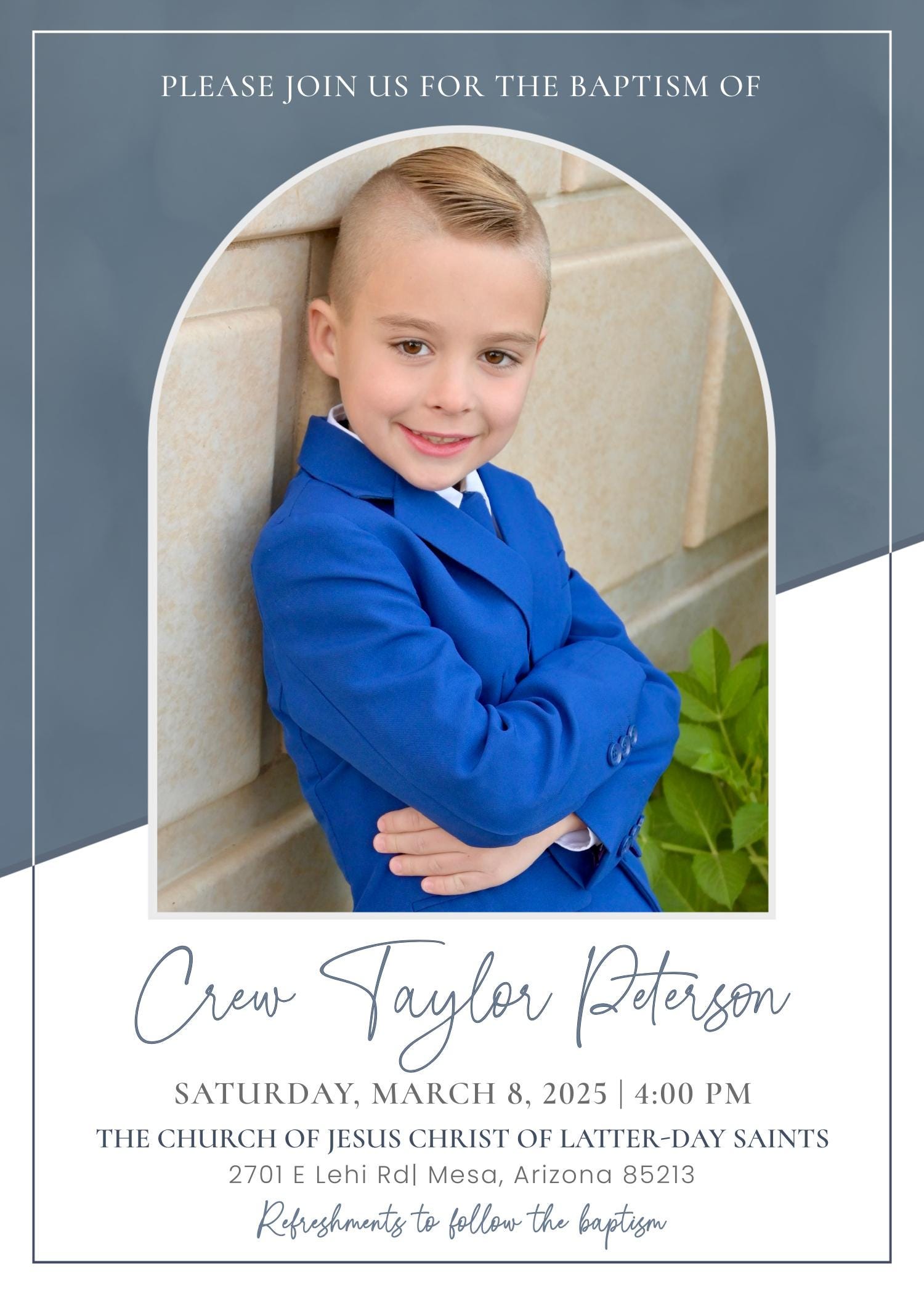 Add a special touch to you son's baptism day with this BAPTISM PROGRAM. Easily add your text and photos to the program template and print today! Be sure to check out the matching baptism invitation here: